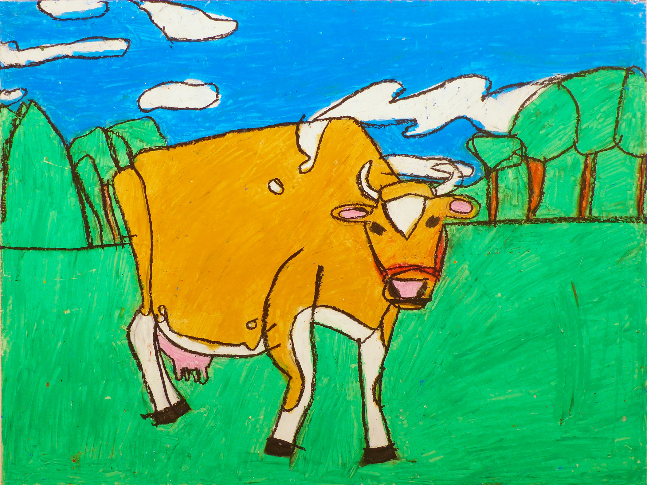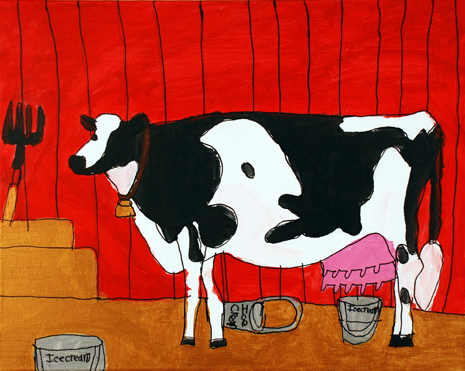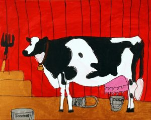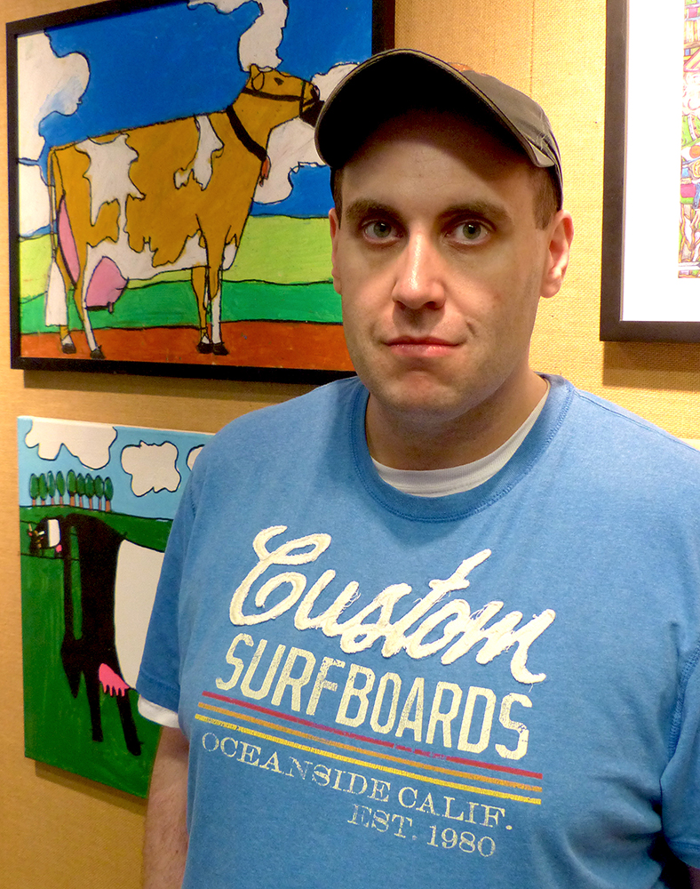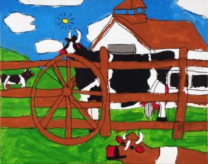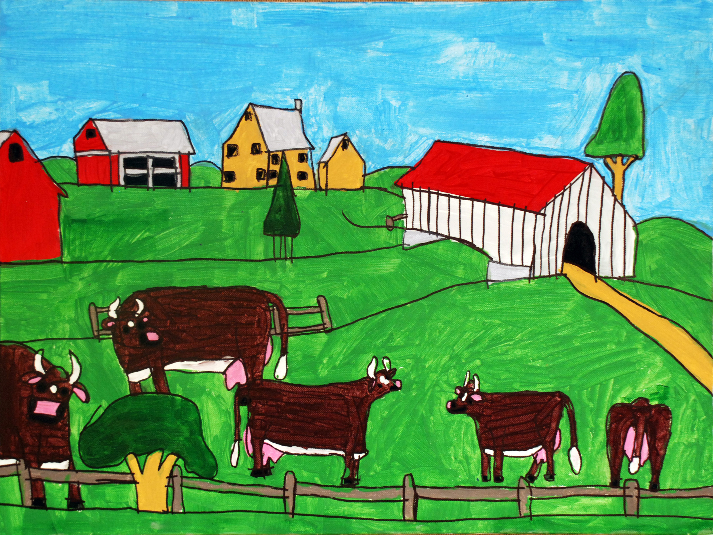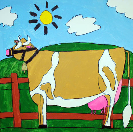 Jacky Wojciechowski was born in 1983 and lives in Staten Island. Wojciechowski has been drawing prolifically since he could pick up a crayon. He began attending PVA in 2007 to further develop his artistic talent, and each Thursday afternoon he bursts into the studio, eagerly looking forward to his session. Painting and drawing only from memory, he quickly gets to work on his favorite subject and lifelong interest, farms and farm animals, particularly cows. Wojciechowski is as at ease filling his canvas with a single detail as he is painting a complex farm scene.